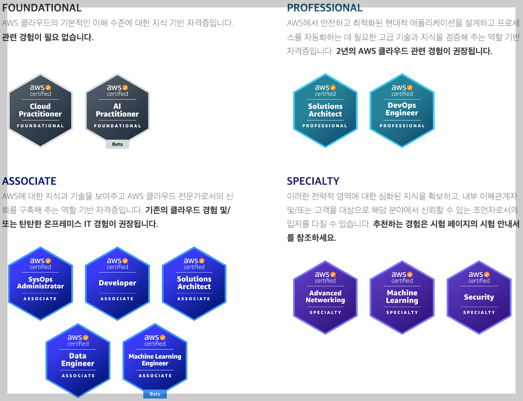 AWS 자격증은 크게 Foundational, Associate, Professional, Specialty로 나뉘어있다. 그중에서 Solutions Architect -Associate는 클라이언트의 비용 및 성능 최적화 솔루션을 설계하는 것에 초점이 맞춰져있다. 문제 상황이나 요구 조건이 주어지고, 이를 충족할 수 있는 기술 설루션을 선택하는 것이 문제로 주어진다.