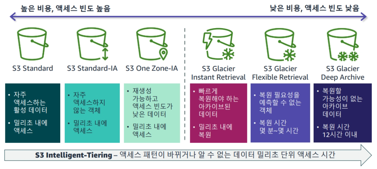 | S3 Standard-IA | 30일 | 즉시 | 있음 | 가끔 접근 |